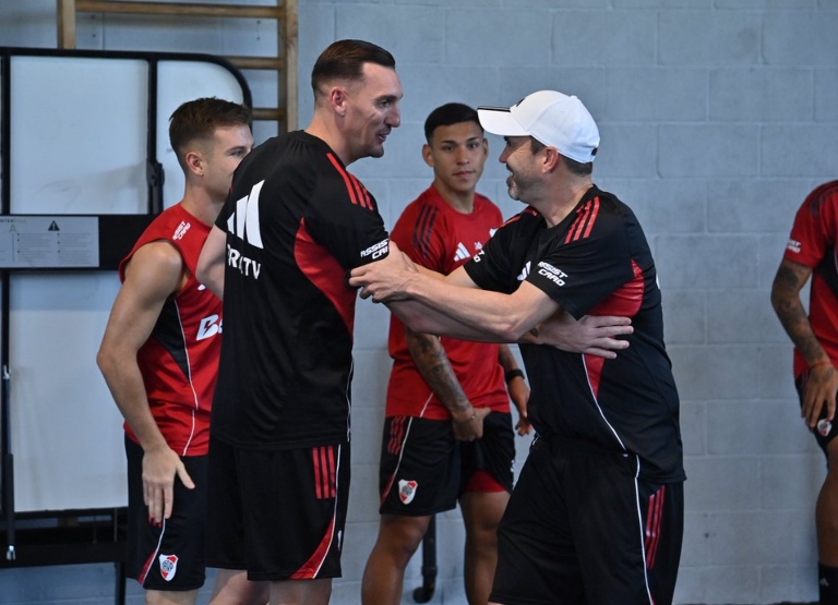 Se vio un clima distendido pero serio. El Chacho aprovechó para saludar afectuosamente a los referentes y a jugadores que ya conocía, ya sea por haberlos enfrentado o por haberlos pretendido en otros mercados (como mencionó en la presentación). Hubo un abrazo especial con Gonzalo Montiel y charlas individuales cortas con Marcos Acuña y Franco Armani.