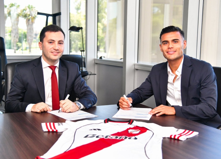 Por la tarde llegó el momento de la firma del contrato, acto que confirmó oficialmente su llegada al club. Minutos después, River compartió en sus plataformas digitales las primeras imágenes del jugador firmando el vínculo, además de sus primeras fotos con la camiseta puesta, ya integrado formalmente al mundo riverplatense.