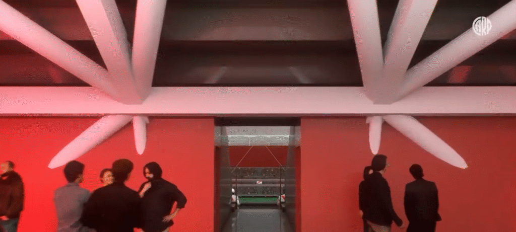 - Fachada ornamental: El render muestra cómo el nuevo diseño se integra con el exterior, permitiendo que el Monumental luzca iluminado de manera decorativa en las noches de partido.